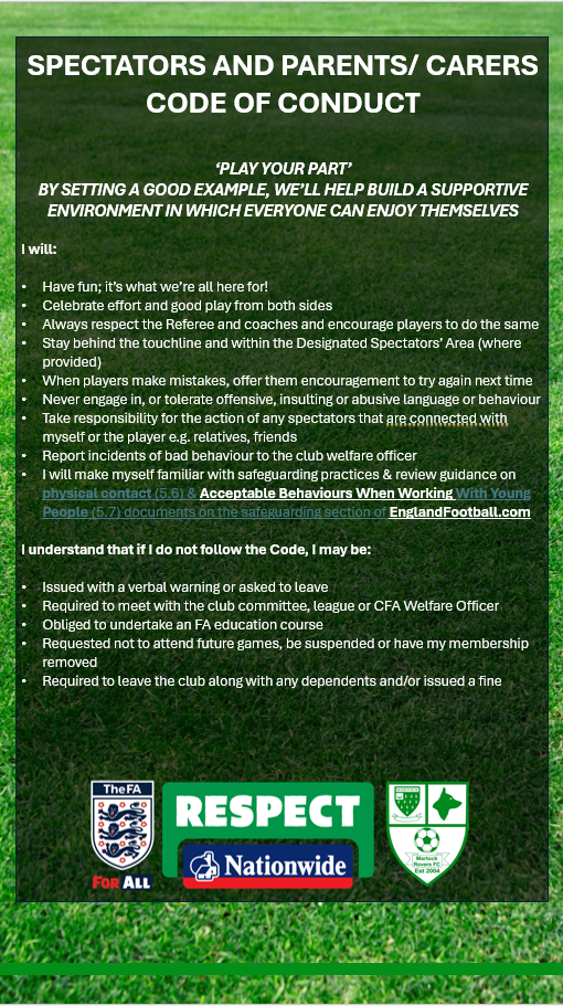 This page contains key documents for all players, parent, carers, spectators and members to familiarise themselves and ensure they are clear on the expectations and guidance set by the club. If you have any safeguarding concerns relating to the below then please contact our Welfare Officer, all details are available in the 'Contact' page.